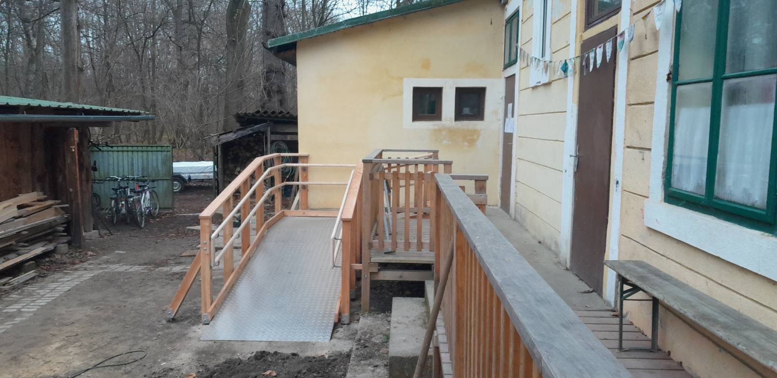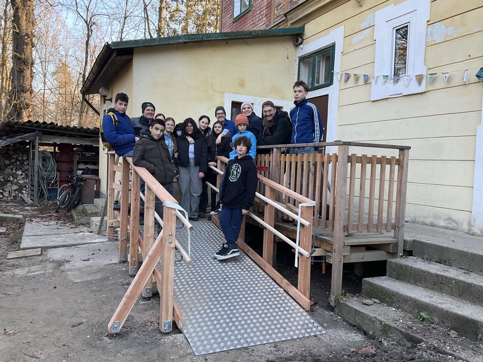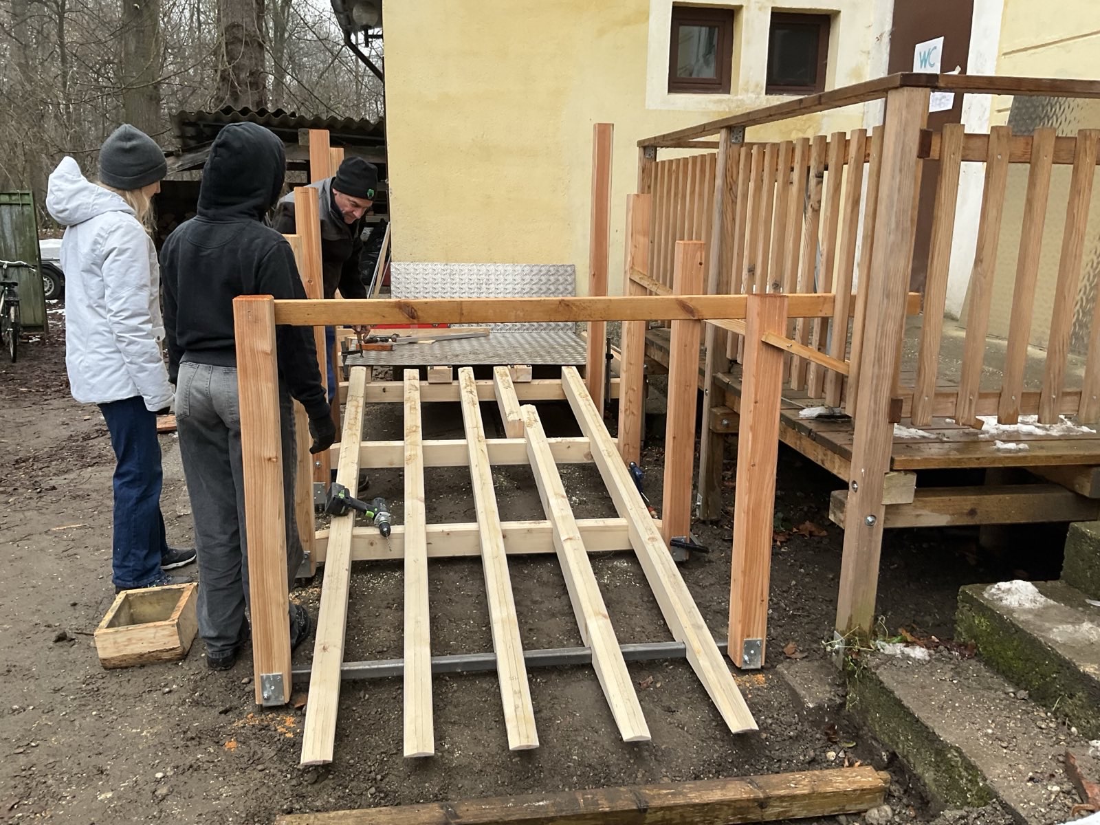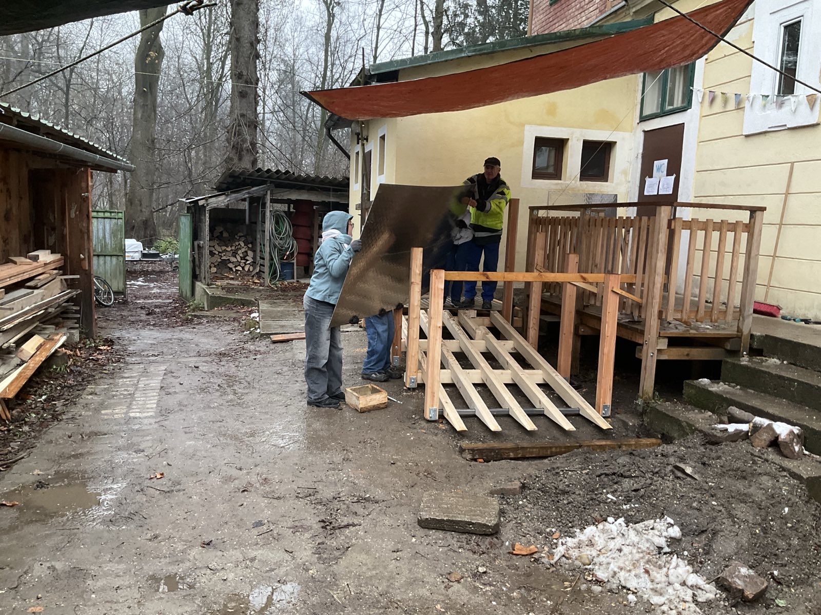 Trotz des Wintereinbruches wurde bei unwirtlichen Bedingungen eine normgerechte Rampe für bewegungseingeschränkte Personen bebaut.